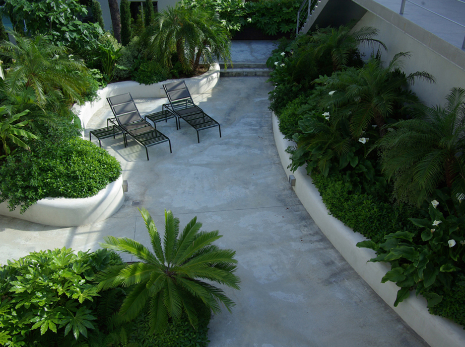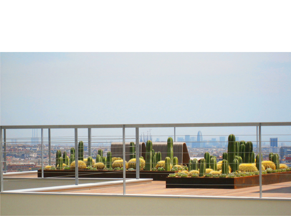 Dans un habitat de Pep Zazurca,création de terrasses sur 1’100 m².Prestations SIA 105 complètes, 2005-2006.Suivi évolutif du jardin, 2006-2019.
