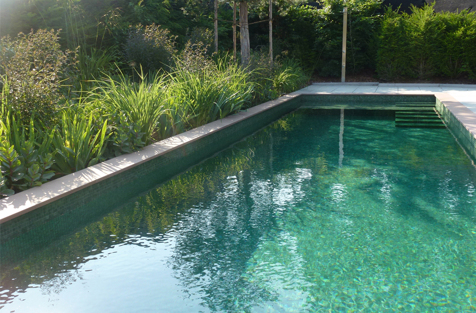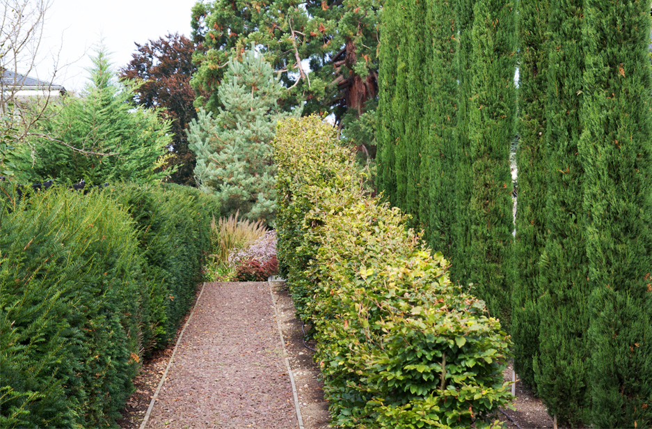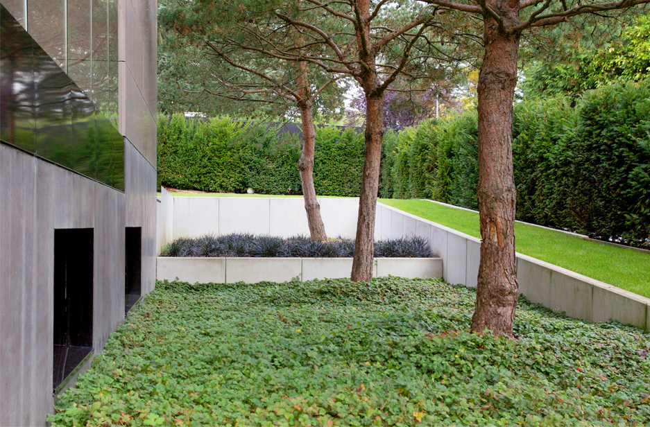 Etude et réalisation d’un jardin en pente de 1'000 m², en harmonie avec une villa de 3bm3. Prestations complètes, 2010-2012. Supervision de l’entretien, 2012-2014.