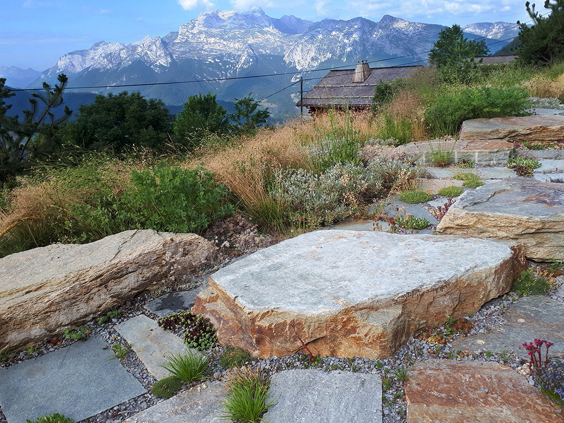 Création d’un jardin alpin de 2'000 m². Travail sur l’expression naturelle et la pierre. Prestations SIA 105 complètes, 2017-2018. Suivi évolutif du jardin, 2018-2019.
