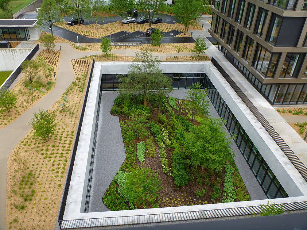 Création de jardins sur toits, de patios et d’esplanade dans un lieu d’échange et de transmission des savoirs de 3 hectares : le Campus Genevois de la Haute Horlogerie, conçu par de Planta et Associés.