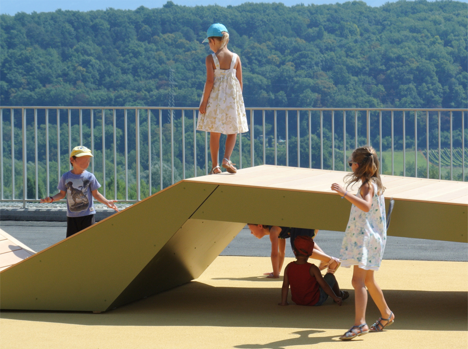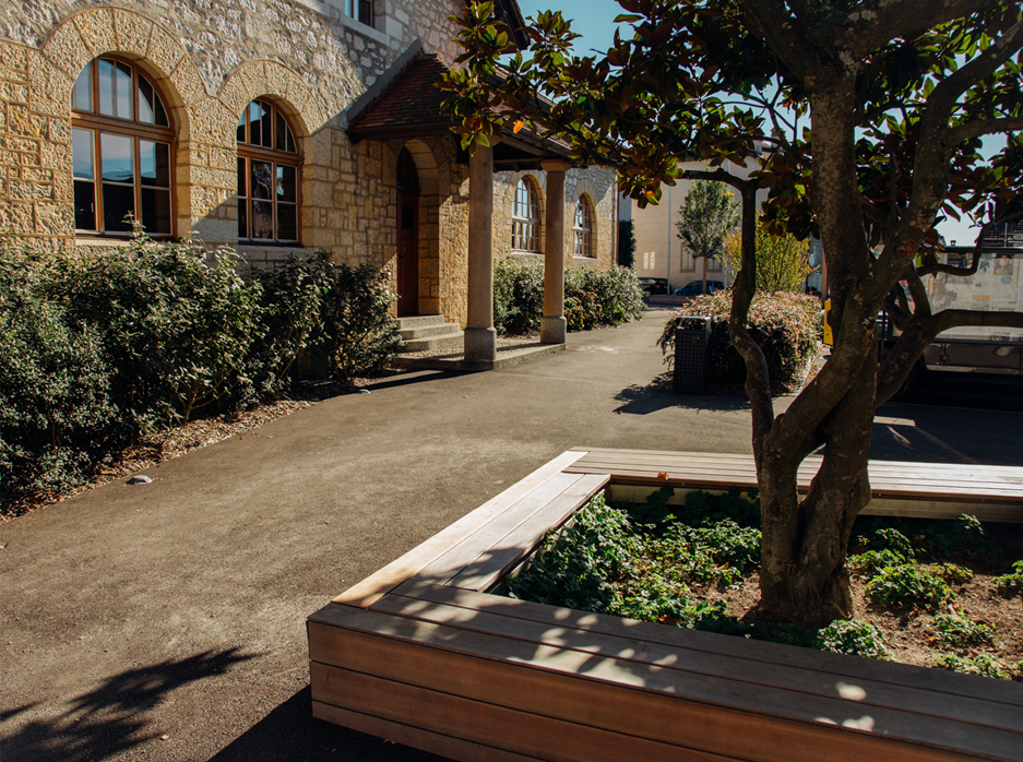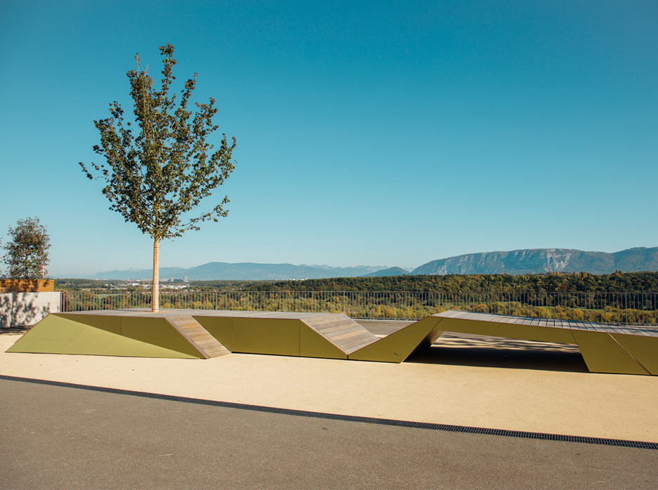 En écho au panorama, conception et réalisation d’un préau + place de 2'500 m² au-dessus d’un parking public, étudié et suivi par d2 architectes Projet paysager lauréat 2013 Prestations SIA 105 complètes, 2014-2018